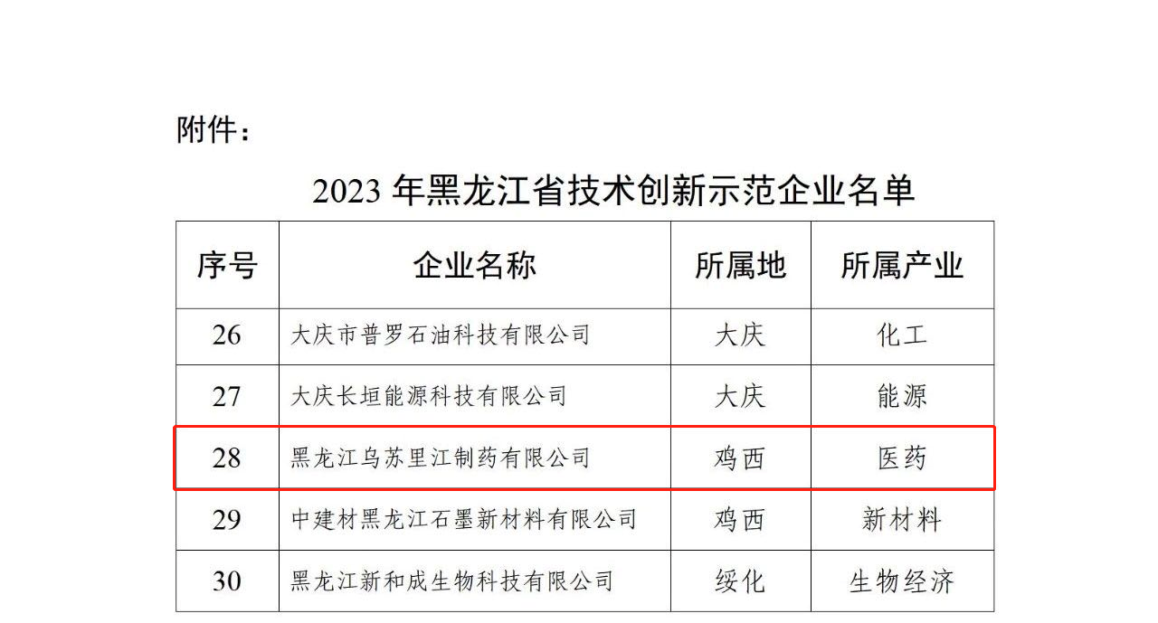 黑龍江烏蘇里江制藥有限公司此次榮獲“2023年黑龍江省技術(shù)創(chuàng)新示范企業(yè)”,對提高科技創(chuàng)新、完善企業(yè)科技創(chuàng)新體系、提升行業(yè)引領(lǐng)能力和提高品牌影響力都具有十分深遠(yuǎn)的意義。